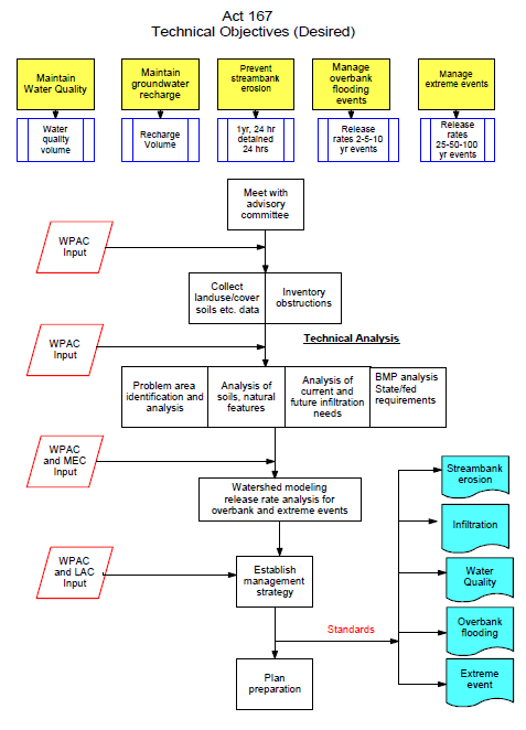 Pennsylvania Act 167 requires counties to prepare and adopt stormwater management plans for each of its watersheds. Act 167 stormwater plans provide uniform technical standards and criteria for the management of stormwater runoff from new land development and redevelopment sites throughout a watershed. These plans are prepared in consultation with municipalities located in the watershed, working through a Watershed Plan Advisory Committee (WPAC) comprised of local officials and other interested parties.