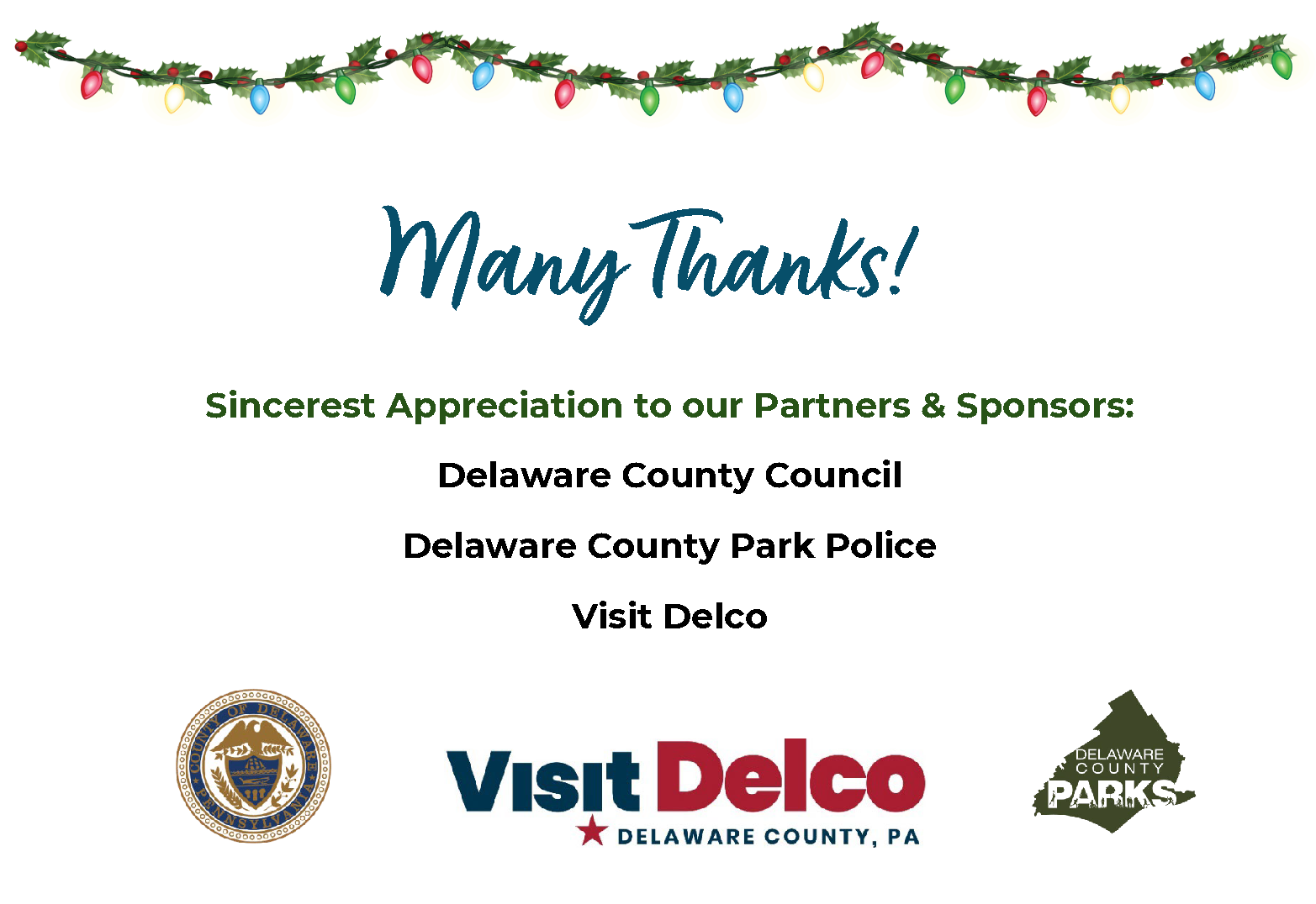 Delaware County Parks & Recreation greatly appreciates your generous support of the holiday light displays. Donations of any amount are welcomed, as every contribution helps offset our operating costs. Unless anonymity is requested, we will recognize our donors on this page as “Tree Toppers” ($250+) & “Evergreen Elves” ($100+).